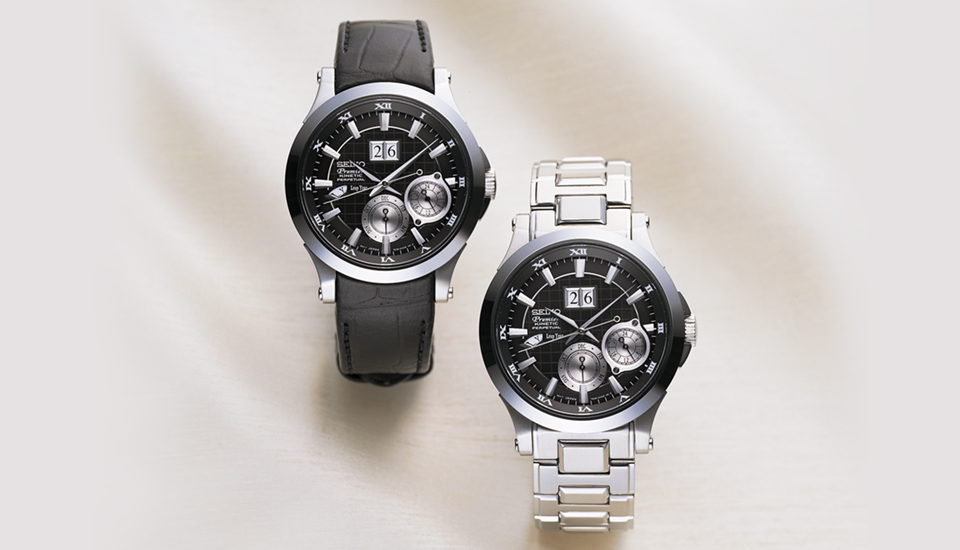Seiko's successful Kinetic watch was equipped with stopwatch function in a very unique pattern. It is equipped with zero resetting office using heart shaped cam and special motion construction that avoids dusts.